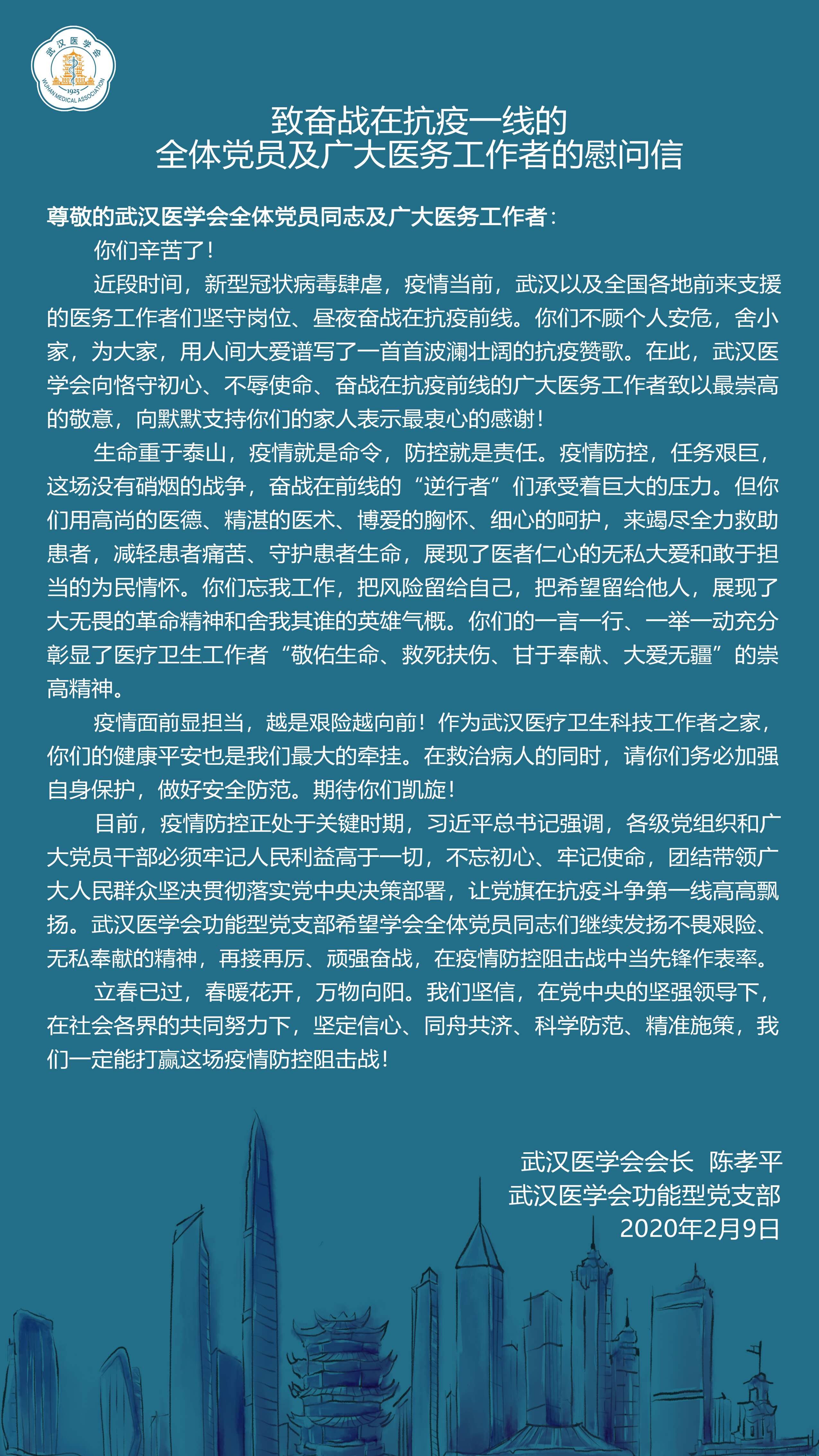 陈孝平院士代表武汉医学会发慰问信——《致奋战在抗疫一线的全体党员及广大医务工作者》