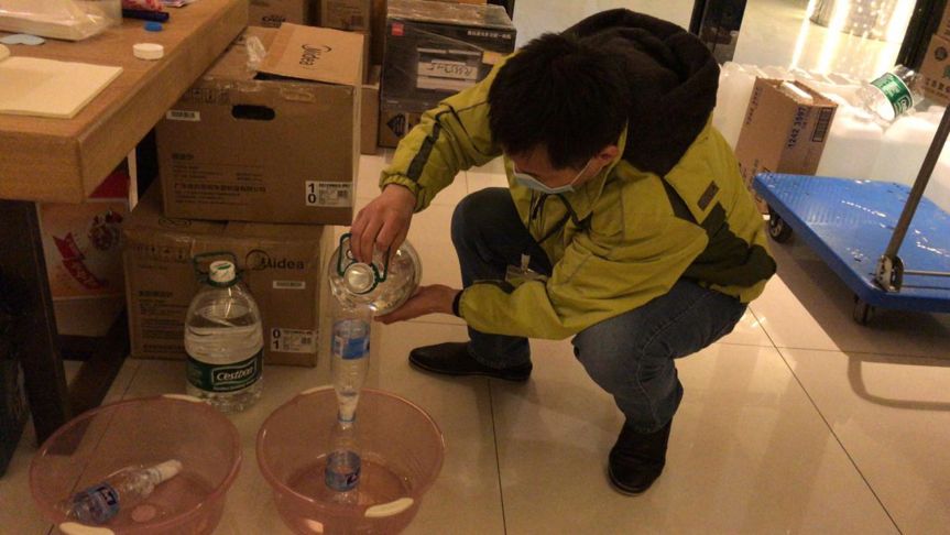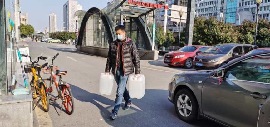 ▲21日,区科协将领取到的大桶酒精,通过自制漏斗,分发酒精,遇到下楼领取酒精的医护人员,哪怕是就餐时间,也马上停止就餐,第一时间为其服务。