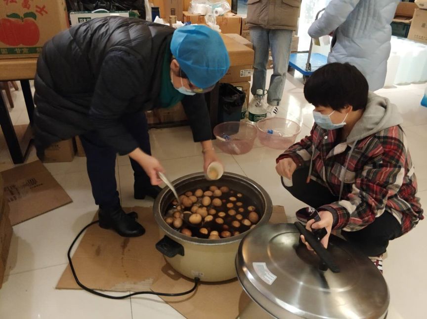 ▲20日当晚,为增强营养和妥善利用捐赠物资,区科协充分利用酒店现有条件,与全季酒店共同制作了爱心茶叶蛋200余个。