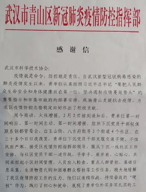 图为青山区新冠肺炎疫情防控指挥部的感谢信