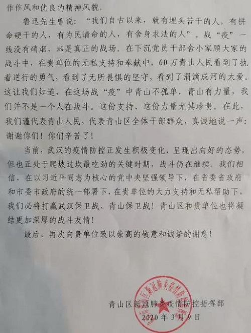 青山区新冠肺炎疫情防控指挥部在感谢信中表示,自2月2日接到通知后,第一时间响应,第一时间出动,第一时间增援,组织下沉党员干部包保联系钢都管委会、白玉山街、八吉府街等3个街道4个社区,为青山区疫情防控态势稳定向好做出积极贡献。