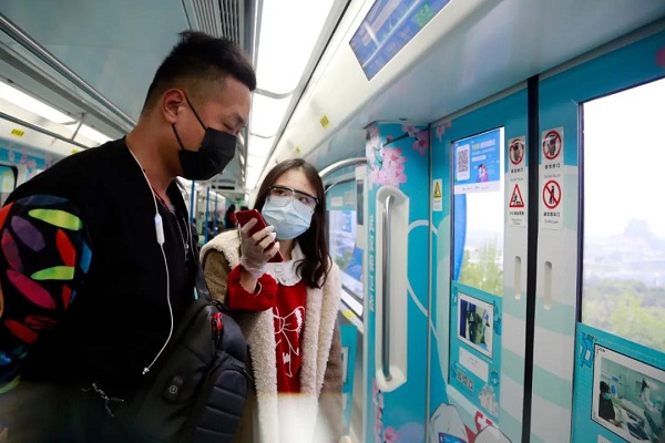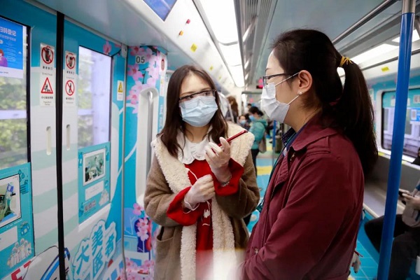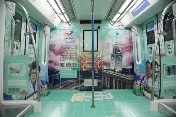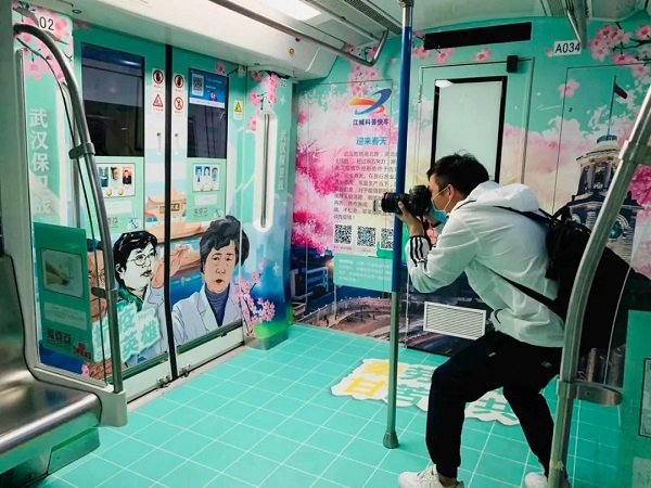 搭乘科普快车地铁1号线前往公司复工的李晓馨说,“车上布置得好醒目啊,那些难忘的瞬间让我们仿佛又回到了疫情期间,真的要感谢白衣天使们。”