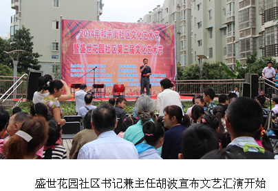 文艺汇演首先由和平街办事处主任郭涛上台致开幕词,盛世花园社区书记兼主任胡波宣布正式开始。