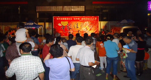 为了丰富居民文化生活,提高居民生活质量,在中秋节来临之际,9月3日,和平街新鑫园社区特邀小白鸽艺术团,举办“庆中秋”惠民活动文艺汇演,居民群众积极响应,并发放计生宣传资料及创卫小贴士达200余份,200余人观看节目。