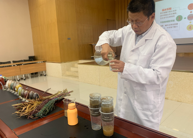 邓老师向两个底部留有几个小孔的塑料瓶子里倒入等量的沙土和水,在其中一个瓶子内加入适量聚谷氨酸。没有加入聚谷氨酸的瓶子内部的水快速通过底部小孔流出,而加入了聚谷氨酸的瓶子内的水则只有少量流出。社区代表们对实验结果发出阵阵感叹,直呼惊奇。四唯街社区居民刘婷说道,以前只听说过“聚谷氨酸”交联后易形成结构稳定的水凝胶,含水量可达2052倍,通过今天的科普之旅才真正对这个数据有了概念,太神奇了。