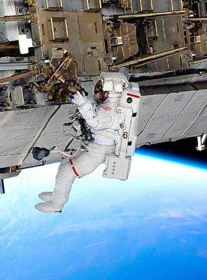 这些看似惊险的图片展现了奋进号宇航员在太空中工作的情景,其中一张图片背景是新西兰南部岛屿的清晰海岸线。另一张图片显示,宇航员将自己固定在太空舱外,正紧张地工作着。而他的脚下便是无边无际的太空。