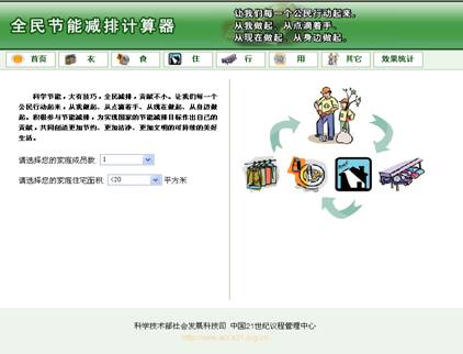 近日,由科技部社会发展科技司和中国21世纪议程管理中心组织专家研制开发的基于Internet 的“全民节能减排计算器”软件完成了研究和测试工作,在网上面向公众开放。