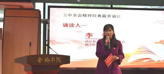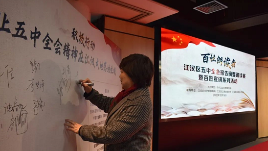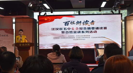 同台诵读、专家分享、抗疫宣讲、集体倡议……作为学习贯彻党的十九届五中全会精神百姓宣讲系列活动之一,12月18日下午,“‘百姓朗读者’——江汉区五中全会报告摘要诵读赛”在区文化和旅游局文体中心多功能厅举行。