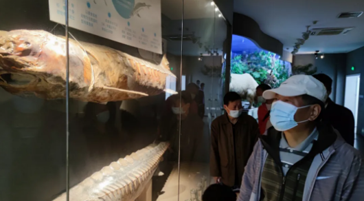在华农博物馆,一级保护动物中华鲟的标本吸引了大家目光,两个中华鲟标本静静地“躺”在玻璃窗内,但是身躯依然饱满似含有无限活力,足以令人畅想其在长江中畅游的景象。讲解员介绍,展柜中的这两条是雌性中华鲟,长江流域的渔民间流传的一句谚语,“千斤腊子万斤象,黄排长大不像样”,其中“腊子”指的就是中华鲟。