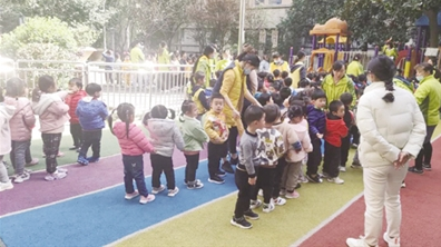 下午3:00警报声响起,幼儿园的应急疏散演练活动正式开始,不到五分钟,幼儿园全体幼儿有序地撤离到幼儿园的操场上。