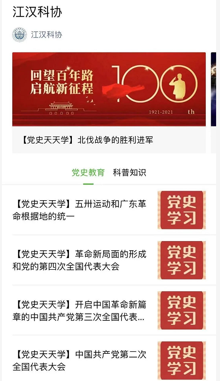 “江汉科协”官方微信开设党史学习教育专栏截图