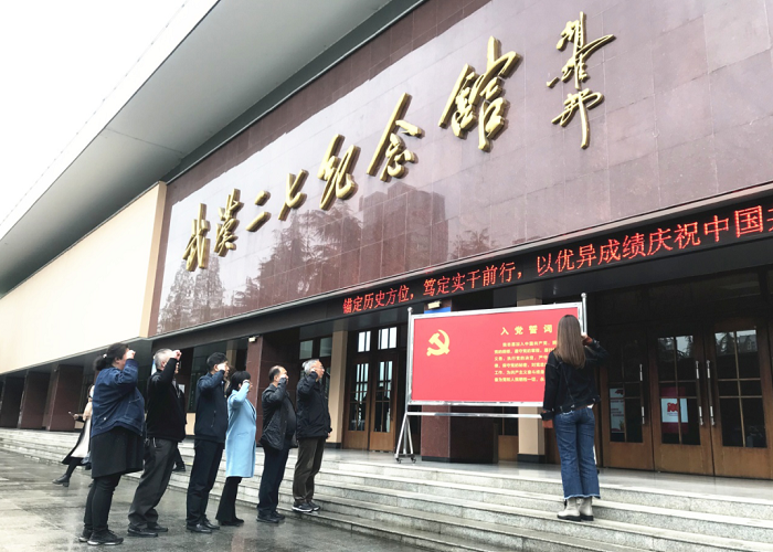 随后,全体党员在二七纪念馆前面对着鲜红的党旗,在党组书记戴晓春的带领下重温入党誓词。