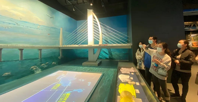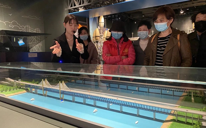 活动最后一站是桥梁博物馆,入馆后代表们在桥梁科技展区的一座沙盘和一面移动滑轨屏前驻足,只见滑轨屏从左到右缓慢移动,通过屏幕上的动画,结合沙盘上与动画相对应的系列模型,形象地展示了一座桥梁从前期设计施工到后期管养检测的全过程。讲解员介绍,传统的桥梁管养主要依靠人工巡检,随着信息化和大数据库的发展,目前城市桥梁管养运用了桥梁健康监测系统、基于智能手机终端的桥梁管养技术、BM等先进技术,已然打造出了新时代的“智慧桥梁”。