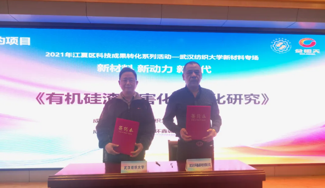 活动现场,由武汉纺织大学“出品”的“有机硅渣无害化资源化研究”项目、“功能性医疗器械设计与研发”项目等6个项目与企业签订了合作协议。