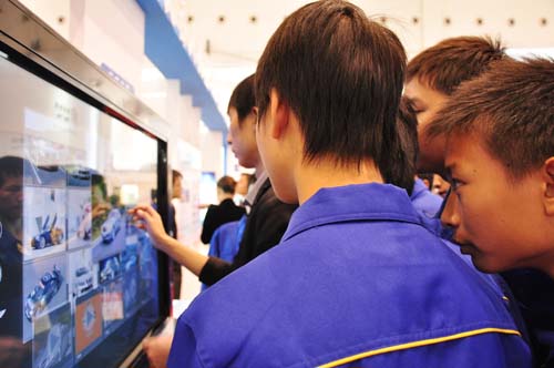 展览会上60寸的人机互动电视宛如一个“大苹果”,其游戏、学习、监控强大功能吸引众多观众。
