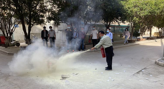 培训会场移至武锅社区小广场,进行消防实战演练。徐老师现场讲解消防前的准备工作及如何正确使用灭火器,由志愿者、社区网格员及安保队员进行现场灭火。在场观看演习的居民朋友跃跃欲试,纷纷拿起灭火器进行“实战演练”。