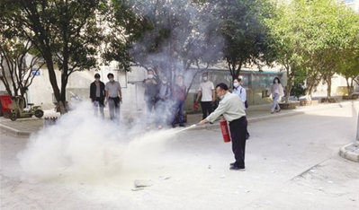 “以手提式干粉灭火器为例,使用前要将瓶体颠倒几次, 让筒内干粉松动;除掉铅封或钥匙、拔掉保险,一手握着喷管, 一手提着压把5在距火焰 2—5米的地方,一手用力压下压把,一手拿着喷管,让喷嘴对准燃烧最猛烈处,左右扫射,尽量使干粉覆盖燃烧区……”培训过程中,授课老师徐德俊结合身边案例,就火灾的预防、消防日常检查、疏散逃生应急自救基本常识和消防器材的正确使用方法等内容进行了详细阐述,在场观看演习的居民拿起灭火器进行“实战演练”。