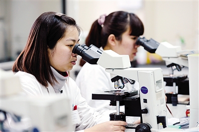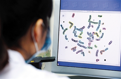 图为12月4日,医务人员在筛查新生儿疾病技术平台做染色体检查。