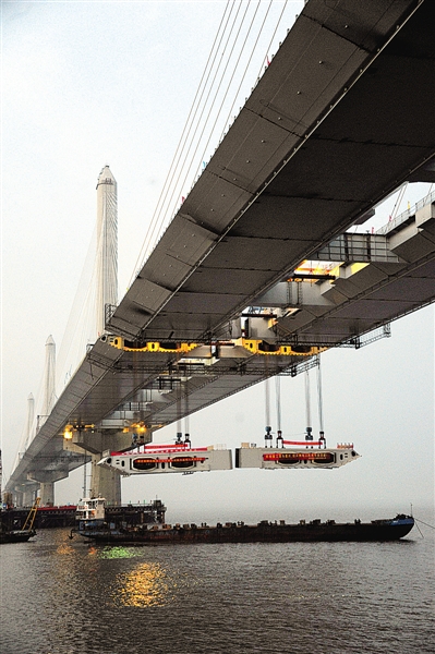 每片重达408吨的钢箱梁缓缓吊向桥面
