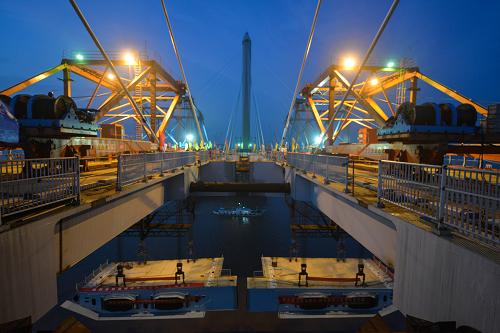 2月3日,随着四台桥面吊机缓缓起升,嘉绍跨海大桥最后两片钢箱梁从水面顺利起吊至40米高的桥面,这也标志着全桥的箱梁吊装全部完成。嘉绍跨海大桥全长2680米的主航道桥部分建成以后,将是世界上最长最宽的多塔斜拉桥,主通航孔满足通航3000吨级集装箱船的需要。目前世界上最长的多塔斜拉桥是法国的米约高架桥,全长2460米。图为每片重达408吨的钢箱梁缓缓吊向桥面。新华社记者徐昱摄