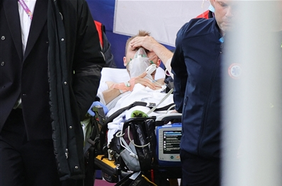 6月13日,欧洲杯丹麦对阵芬兰的比赛,突发状况。在43分钟时,丹麦队球星埃里克森在丹麦禁区附近的边线,接应队友一个界外球时,在无球员接触的情况下,突然倒地。通过电视画面,我们能看到埃里克森在倒地后失去意识,随即裁判立刻请医疗小组进场,而后队医开始对埃里克森进行心肺复苏术。13分钟后,经过抢救后的埃里克森被担架抬离球场,照片中显示埃里克森头戴氧气面罩,已经恢复意识。