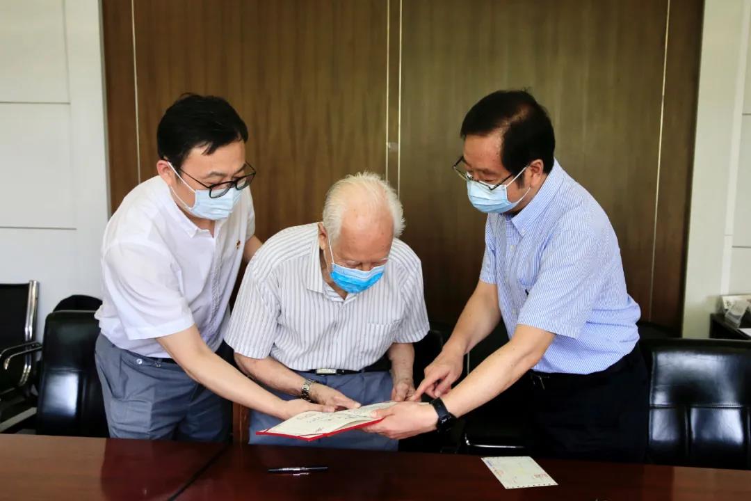 刘立勇、张若光共同为黄旭华院士颁发捐款证书,刘立勇为“武汉科普发展公益基金”授牌。