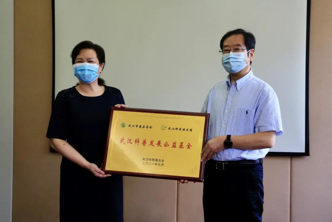 刘青和郑辉分别代表武汉科技馆、武汉市慈善总会签订设立“武汉科普发展公益基金”协议,黄旭华院士与刘青、郑辉签订捐赠协议。