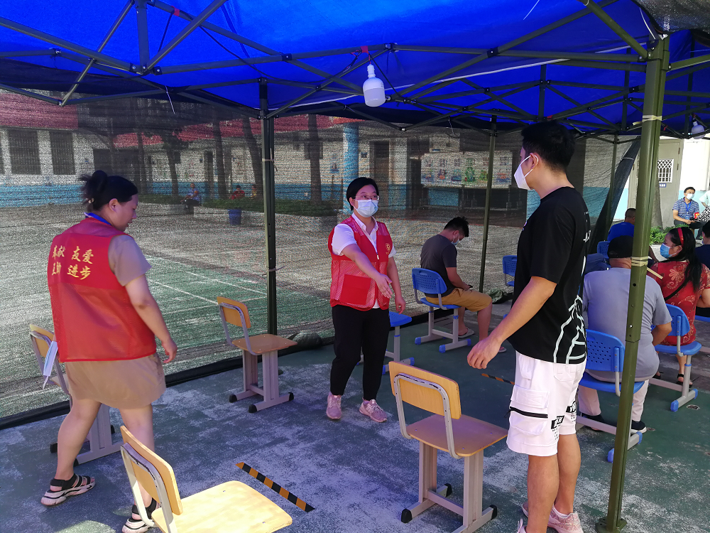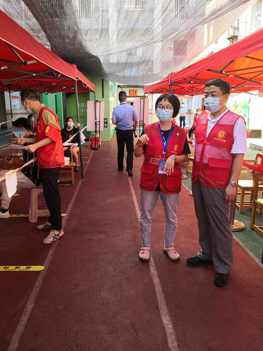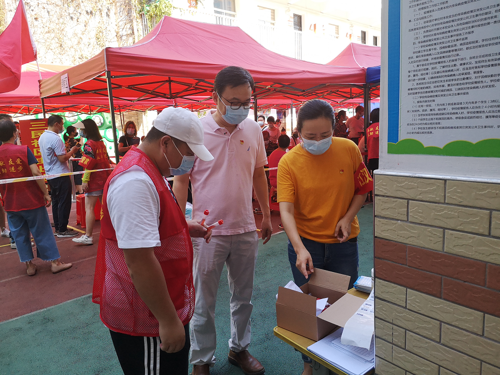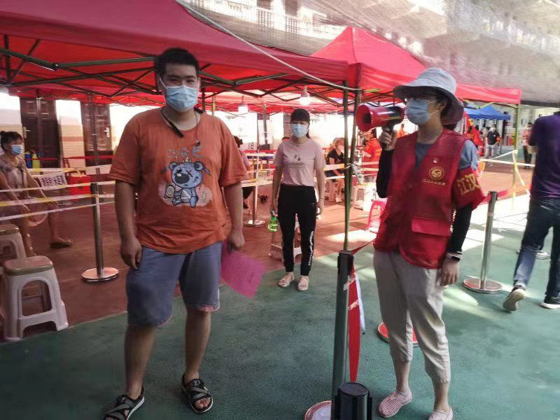 “天气炎热,戴着口罩更热,我们多跑两趟,居民就能更快的完成检测。”市科协下沉党员张黎,正在忙着进行人员登记。“请还没有做核酸检测的居民,前来检测点进行核酸采样”从前天到岗后他一直忙着在小区喊话,通知居民去做核酸检测,确保不落一人,今早清晨又赶到社区协助登记。