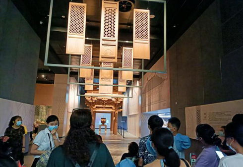 在讲解员的带领下,我们从中国最早的干栏式建筑发源地河姆渡遗出发,一路上,我们了解到了中国建筑的鼻祖人物鲁班。原来锯子是他在砍树途中被锯齿状的叶子划破了手后,深受启发发明创造的。继续往前,我们学习到了具有中国建筑特色的斗拱结构;参观了太和殿的内部构造;见识到了世界现存最古老高大的全木结构高层塔式建筑——应县木塔。当听说这座塔足足有67.31米高时,有同学发自内心的感叹,真是应了李白那句“危楼高百尺,手可摘星辰。”大家都纷纷沉醉于古代劳动人民的智慧之中。