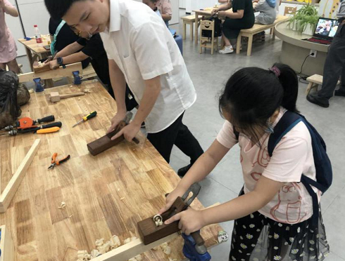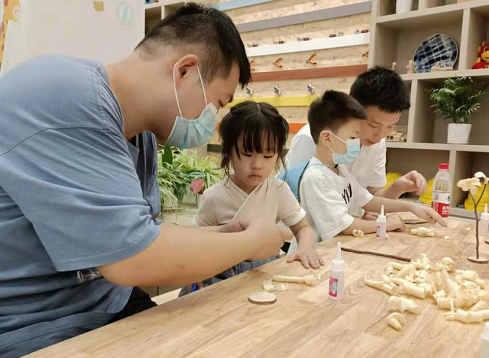 活动最后,社工邀请小朋友们一同参与创意手工——刨花玫瑰的制作。利用刨子让刀刃与木头亲密接触,使原本坚固的木头变成一片片美丽的刨花。再用剪刀裁剪成玫瑰花瓣的形状,然后用酒精胶将这些“花瓣”一层一层粘贴在细长的小树枝,一朵别致的刨花玫瑰花就完成啦!