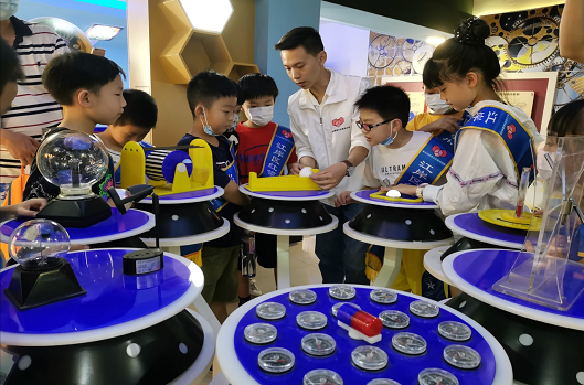 此次科学实践活动由科技馆参观讲解、科学魔术课学习、模拟学习科技馆讲解三部分构成。活动现场,在科技志愿者的带领下为青少年讲解科学知识与原理,大家紧跟志愿者讲解围观,有序参观科技馆。