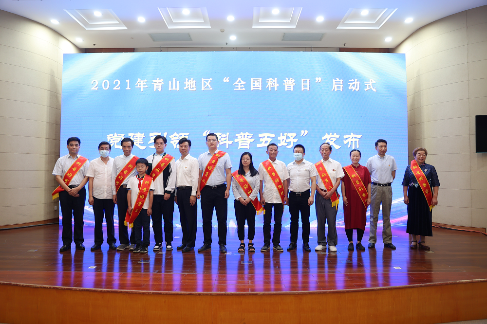 青山区委副书记、区委政法委书记雷利军,区人大副主任董俊,区人民政府副区长周斌,区政协副主席刘韧给青山区10位“最美科技工作者”代表、10位“科普五好”代表授绶带。
