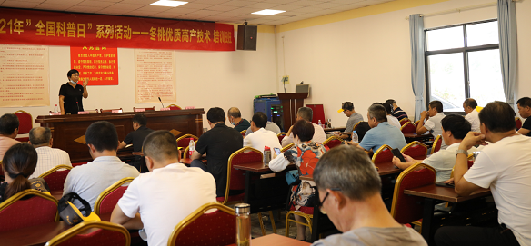 9月11日,黄陂区科协联合黄陂区冬桃协会邀请山东省寿光市冬桃种植专家、助理农艺师苏学玉在蔡家榨街凤凰寨村开展了2021年黄陂区“全国科普日”系列活动——冬桃优质高产栽培技术培训班。黄陂区科协党组成员、副主席丁小虎,黄陂区科协二级调研员雷一鸣,黄陂区科协办公室负责人吴亚南,蔡家榨街农服中心主任、街科协副主席詹建辉,黄陂区冬桃协会会长梅四民,以及黄陂区冬桃协会全体会员、部分冬桃种植户户主共40余人参加活动。