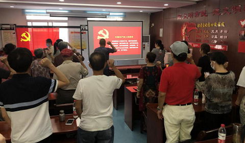 活动在《国歌》雄浑的旋律中拉开序幕,老党员们在鲜红的党旗下重温入党誓词,社区党支部书记朱书记带领党员深入学习习近平总书记近期重要讲话和指示精神。