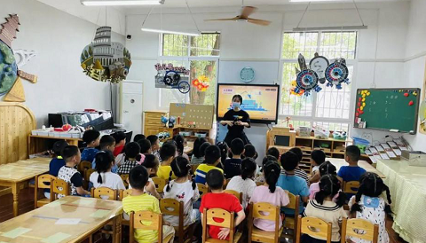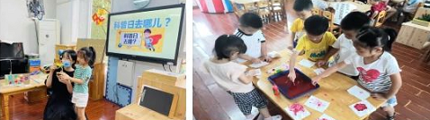 大班幼儿则通过科学小实验证明了靠电发力的风车在没有风的情况下是不会动的;孩子们还用染料制作五星红旗,孩子们在制作五星红旗的过程中,感受祖国的魅力,表达了孩子们对国家和五星红旗的热爱。