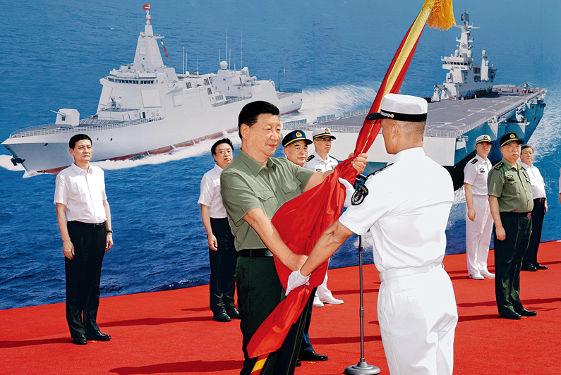 2021年4月23日,海军三型主战舰艇——长征18号艇、大连舰、海南舰在海南三亚某军港集中交接入列。中共中央总书记、国家主席、中央军委主席习近平出席交接入列活动并登上舰艇视察。这是习近平向长征18号艇授予军旗、命名证书。