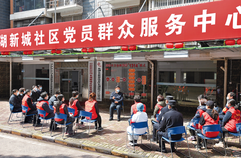 2020年3月10日,中共中央总书记、国家主席、中央军委主席习近平专门赴湖北省武汉市考察新冠肺炎疫情防控工作。这是习近平在东湖新城社区党群服务中心,同社区工作者、基层民警、卫生服务站医生、下沉干部、志愿者等亲切交流。