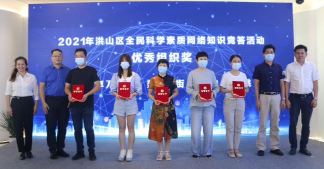 市区领导和嘉宾为2021年洪山区全民科学素质网络知识竞答颁发街乡优秀组织奖证书