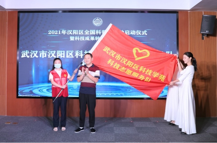 现场,汉阳区委常委、宣传部长殷昌友为琴断口街龙祥社区科技学苑活动中心科技志愿服务队授旗。
