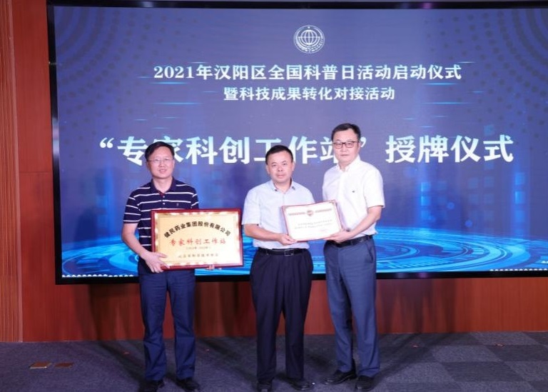 党组成员、副主席张若光为健民药业集团股份有限公司授予“专家科创工作站”荣誉牌,并为华中科技大学药学院院长、教授、博导张勇慧同志颁发专家聘书。