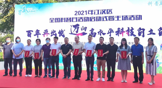 市科协党组成员、副主席郑华,区委副书记、政法委书记陈红山,区政府副区长张智勇、区政协副主席刘惠平等市、区领导先为荣获2021年江汉区优秀科技企业授牌,随后为2021年江汉区优秀科技工作者颁发证书。区委副书记、政法委书记陈红山为江汉区科技志愿服务队授旗,区政府副区长张智勇为江汉区常青街道科技志愿服务队授旗。