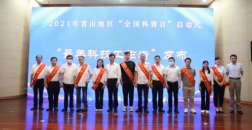 青山区委副书记、区委政法委书记雷利军,区人大副主任董俊,区人民政府副区长周斌,区政协副主席刘韧给青山区10位“最美科技工作者”代表、10位“科普五好”代表授绶带。