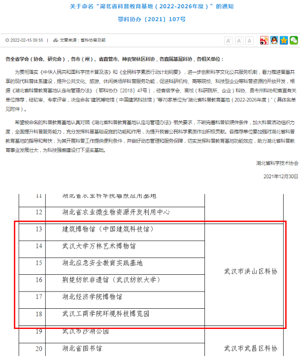 近日,从湖北省科协获悉,由洪山区科协推荐建筑博物馆(中国建筑科技馆)、武汉大学万林艺术博物馆、湖北应急安全教育实践基地、荆楚纺织非遗馆(武汉纺织大学)、湖北经济学院博物馆、武汉工商学院环境科技博览园等6家单位获得“湖北省科普教育基地(2022-2026年度)”命名。