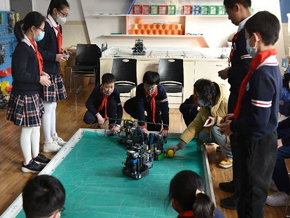 “有空位了!快,绕回射球!”正操纵着机器人手柄的李若菲小朋友喊道,随着射球成功,胜利的欢呼声在教室响起。这场紧张的VEX机器人足球挑战赛,在江岸区花桥小学的创客室落下帷幕。两名女选手巾帼不让须眉,操控娴熟、配合默契,最终以3:0战胜对手。