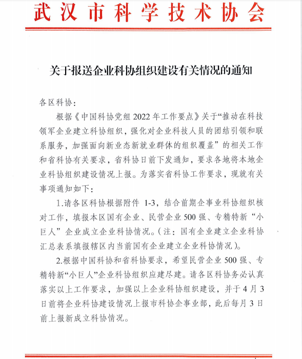 关于报送企业科协组织建设有关情况的通知