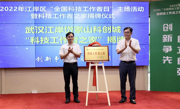 党组成员副主席张若光、江岸区委常委组织部部长谭东升共同为岱家山科创城“科技工作者之家”揭牌。