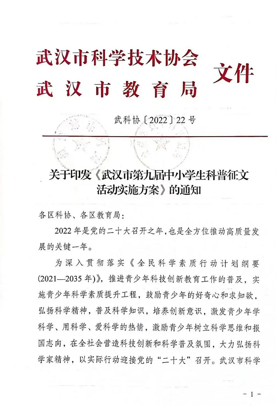 2022年是党的二十大召开之年,也是全方位推动高质量发展的关键一年。为深入贯彻落实《全民科学素质行动计划纲要(2021—2035年)》,推进青少年科技创新教育工作的普及,实施青少年科学素质提升工程,鼓励青少年的好奇心和求知欲,弘扬科学精神,普及科学知识,激励青少年树立科学思维和报国志向,在全社会营造科技创新和科学普及氛围,大力弘扬科学家精神,以实际行动迎接党的“二十大”召开。、武汉市教育局联合主办,江城科普在行动——“我的科学梦”,武汉市第九届中小学生科普征文活动。