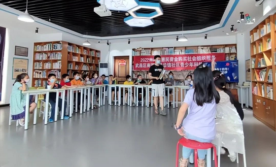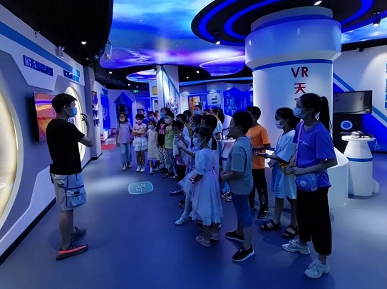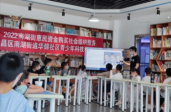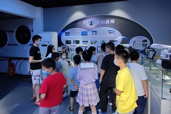 活动开始,社区青少年在志愿者付豪彪老师的带领参观学习南湖航空航天科技馆,在老师有趣的讲解下,学生们亲身体验航天文化,并感受到航天科技的神奇魅力。