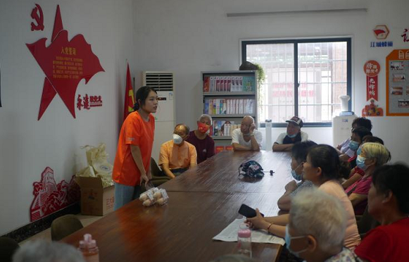 知识科普结束后,志愿者与现场的社区居民展开互动问答环节,提出了一系列问题——“瘦肉中没有脂肪是对的吗?”“常见的反式脂肪酸有哪些?”“早晨起床后不宜饮水吗?”居民们纷纷踊跃发言,分享出自己的生活经验与看法,同时也抛出了自己的困惑。其中一位奶奶问道:“鸡蛋打开后蛋黄散了还可以吃吗?”志愿者对此做出了解答,蛋黄散开也有可能是由于剧烈摇晃而导致的,只要蛋黄和蛋白颜色、气味正常,依旧是可以食用的。也可以闻一闻气味,如果有异味,就一定不要再食用了。志愿者同时为积极参与互动的观众发放礼品。