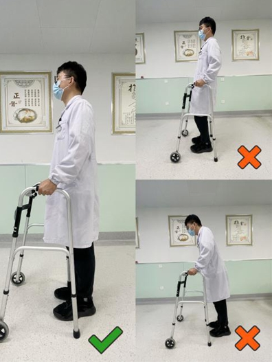 双手扶住把手,双肘微屈30度,双脚站立在助行器两个后脚连线上,身体自然直立,向前迈步时,双手自然前伸移动助行器,左右脚分别向前迈步至助行器后脚连线上。